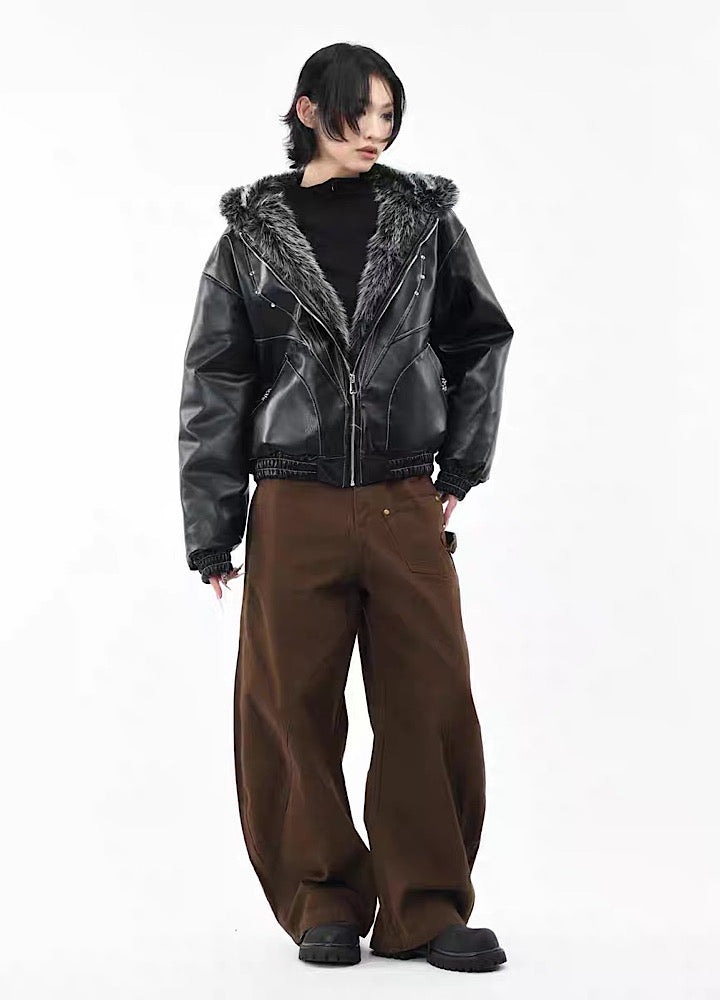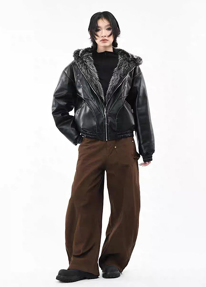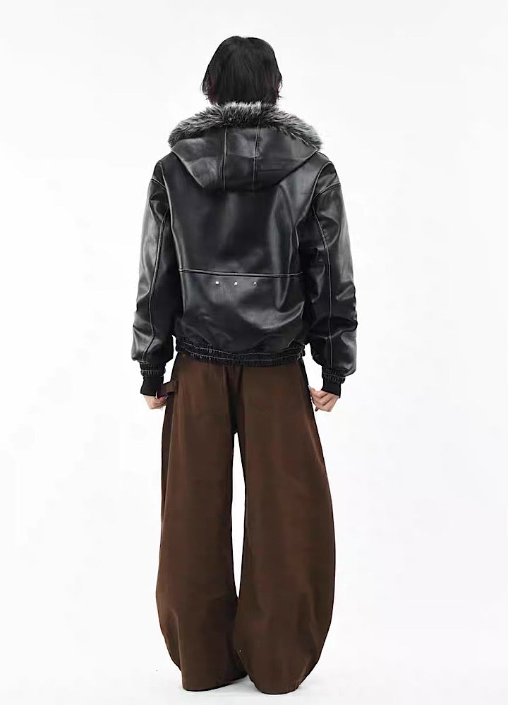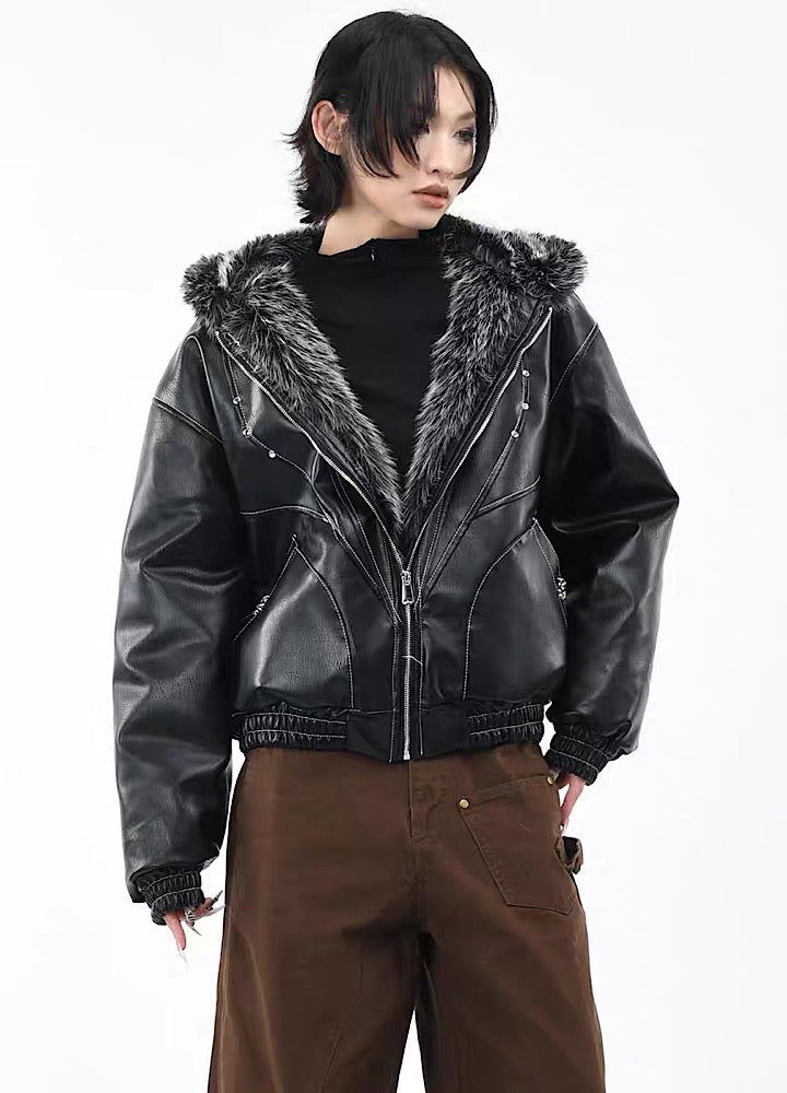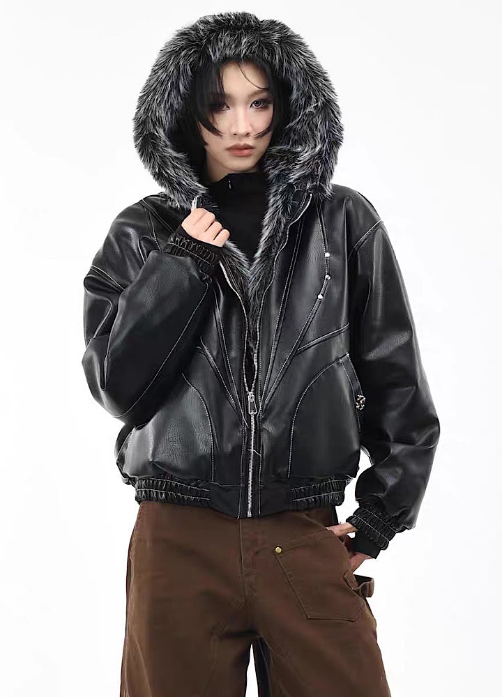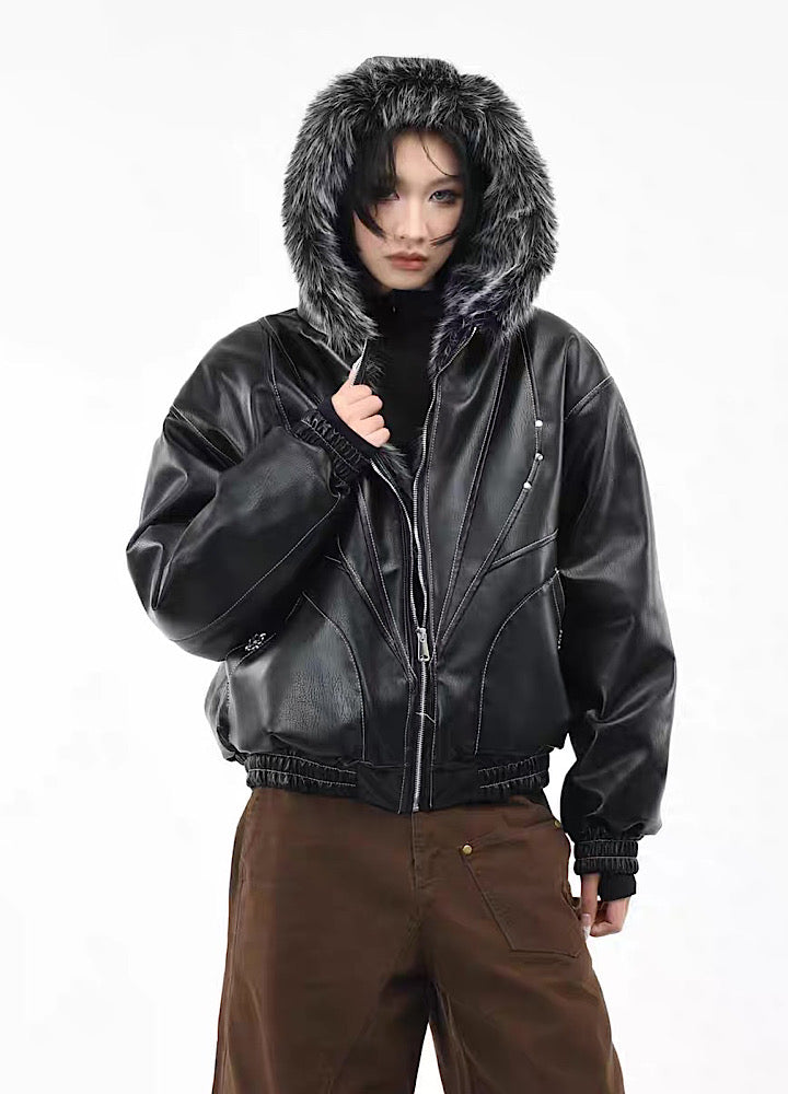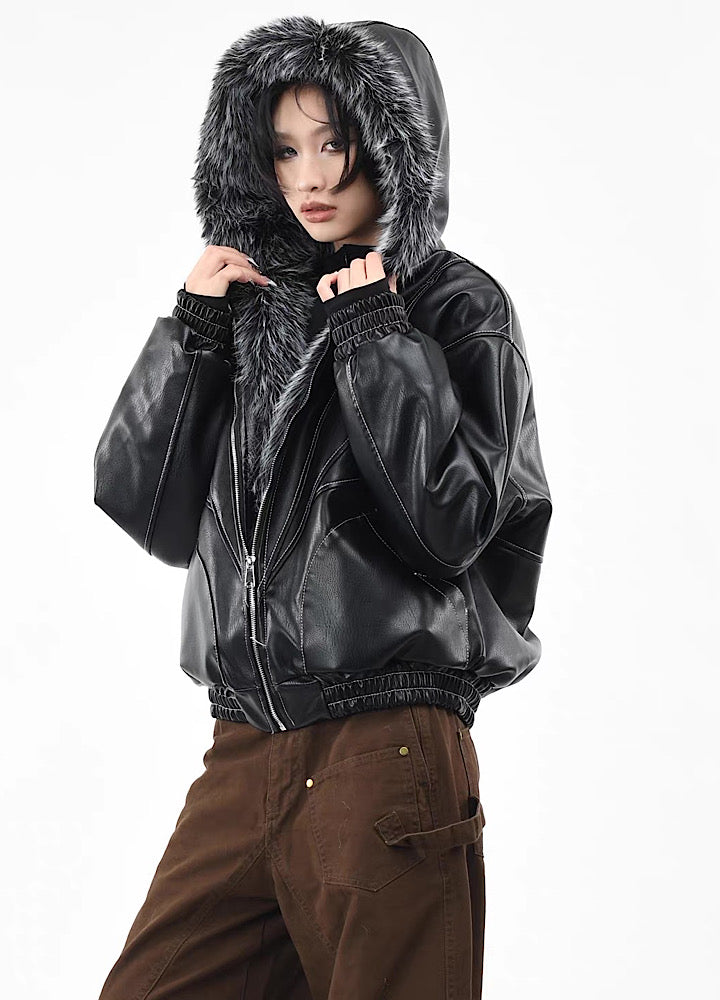 【OV】Synthetic leather design simple style fur hoodie mode jacket OV0014