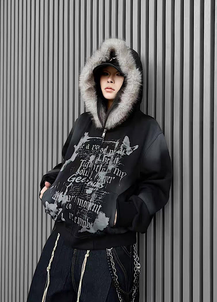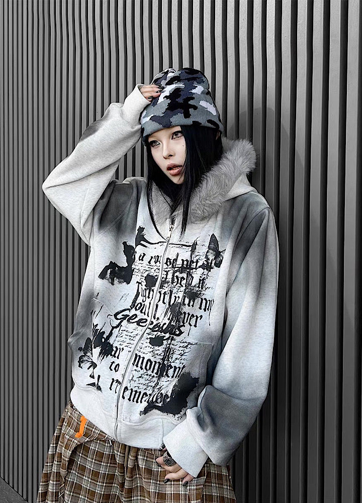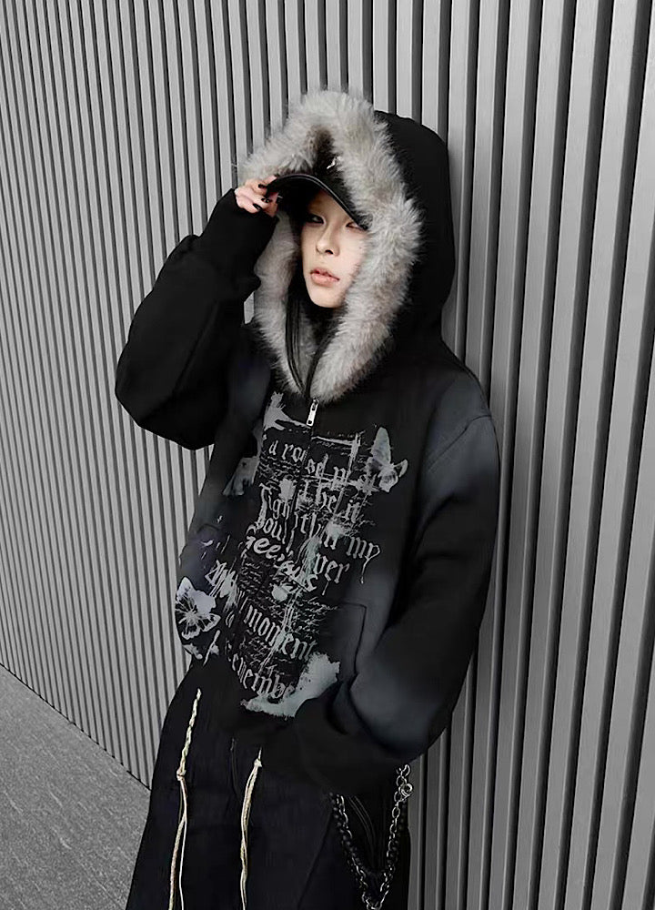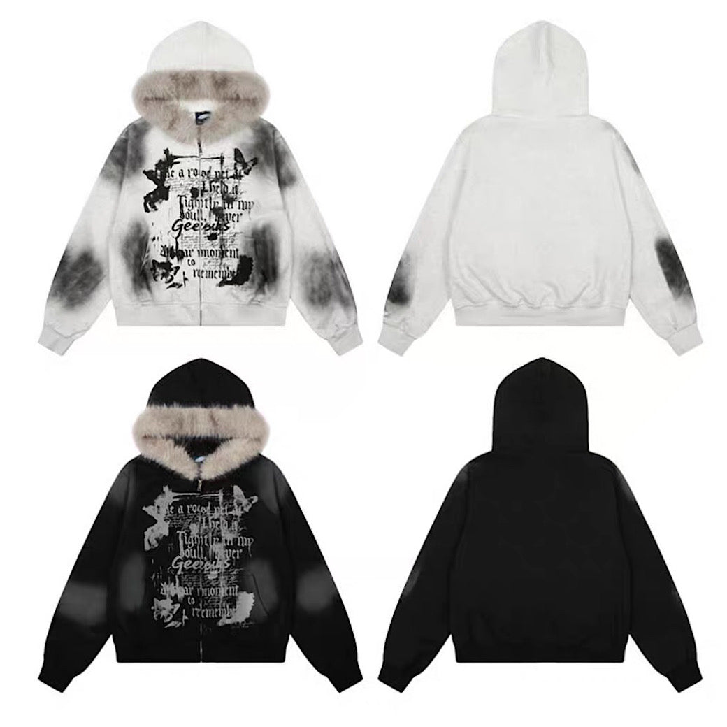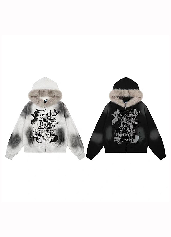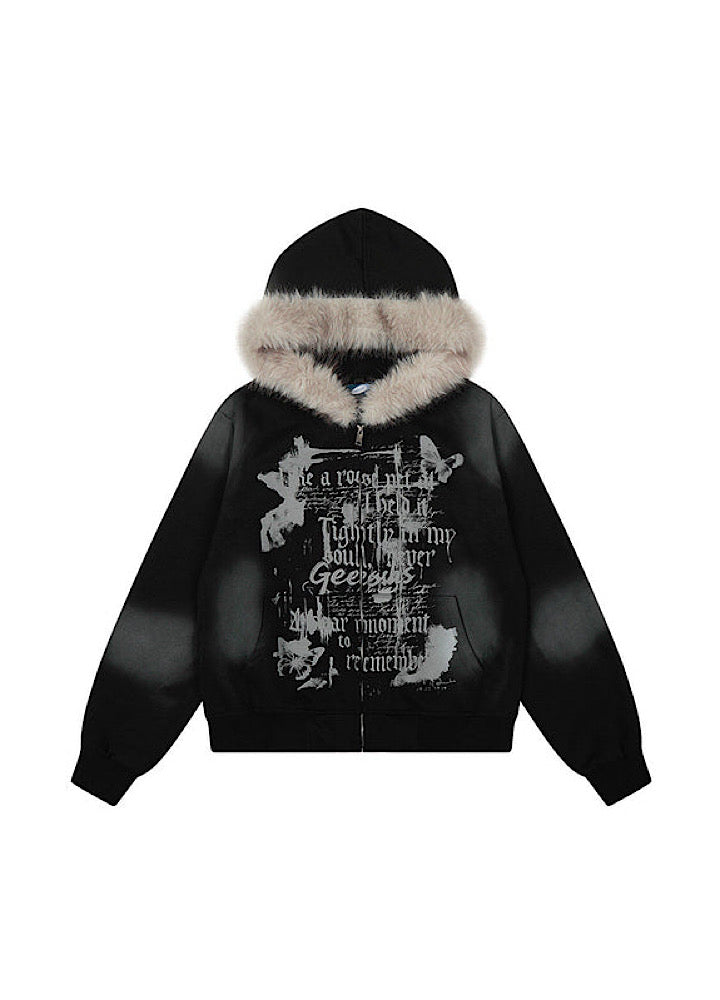 【TR BRUSHSHIFT】Muted wash front design fur hoodie TB0091