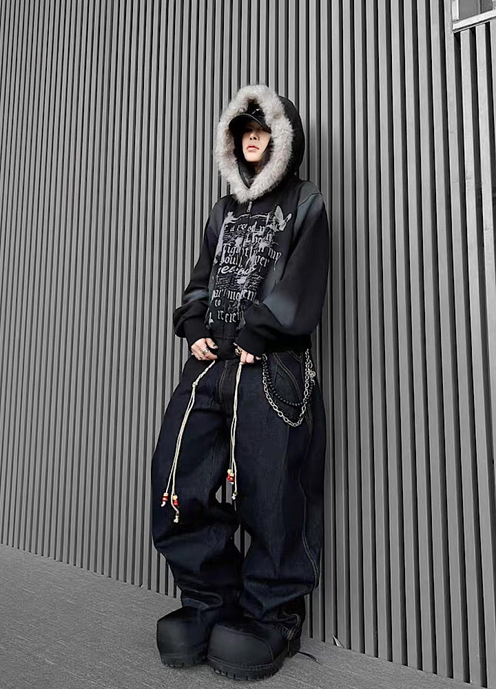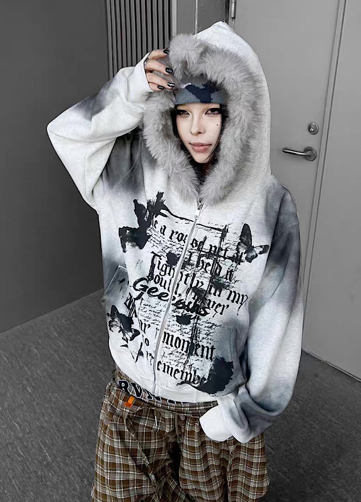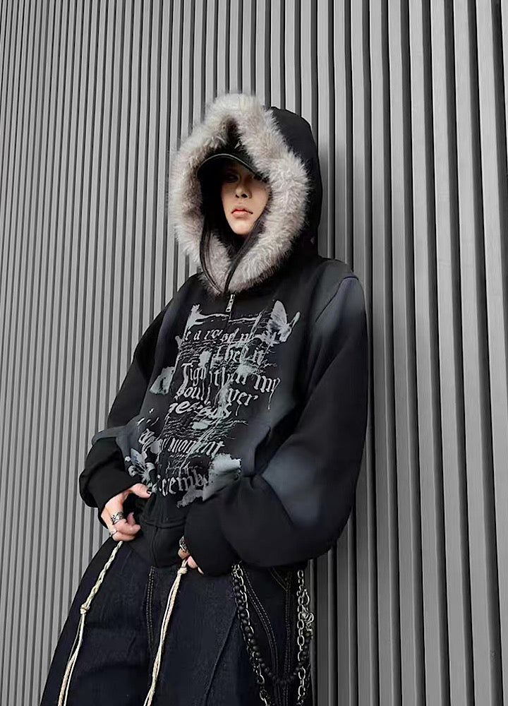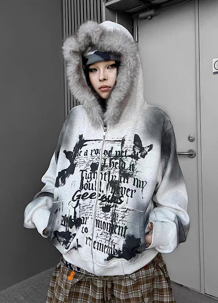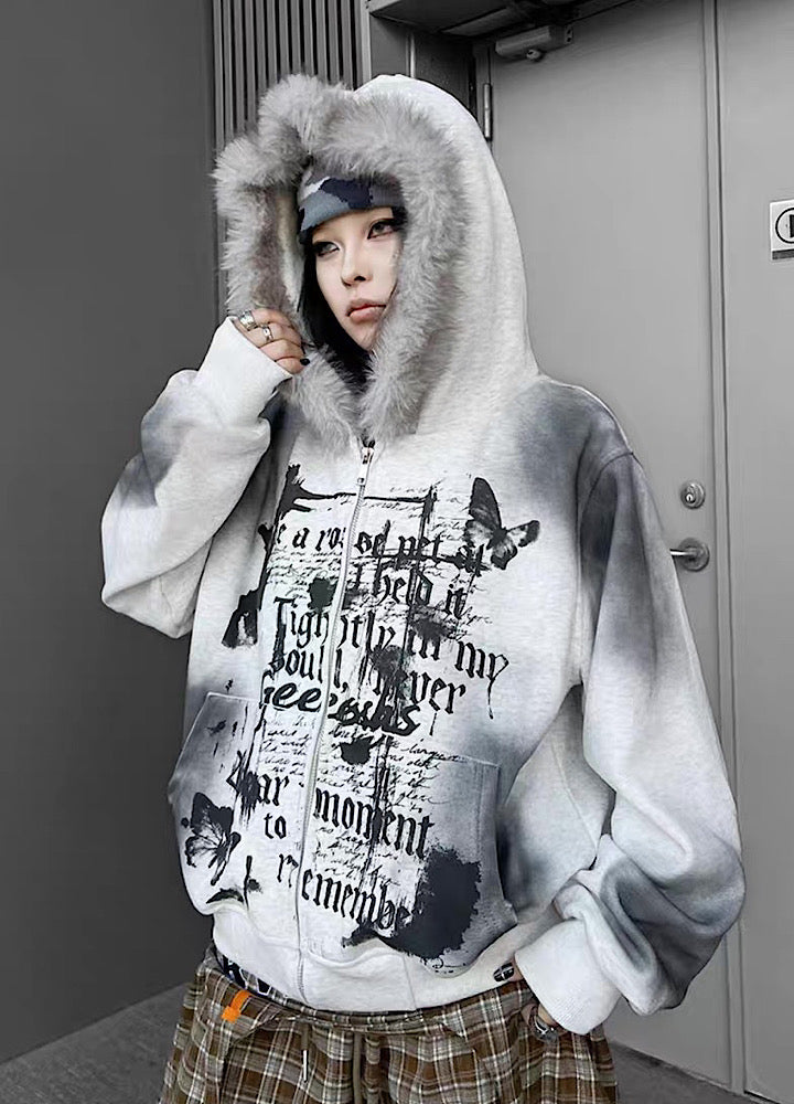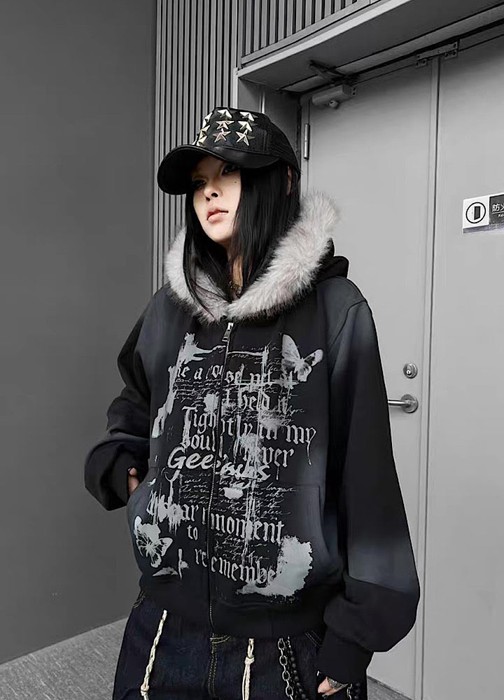 【TR BRUSHSHIFT】Muted wash front design fur hoodie TB0091