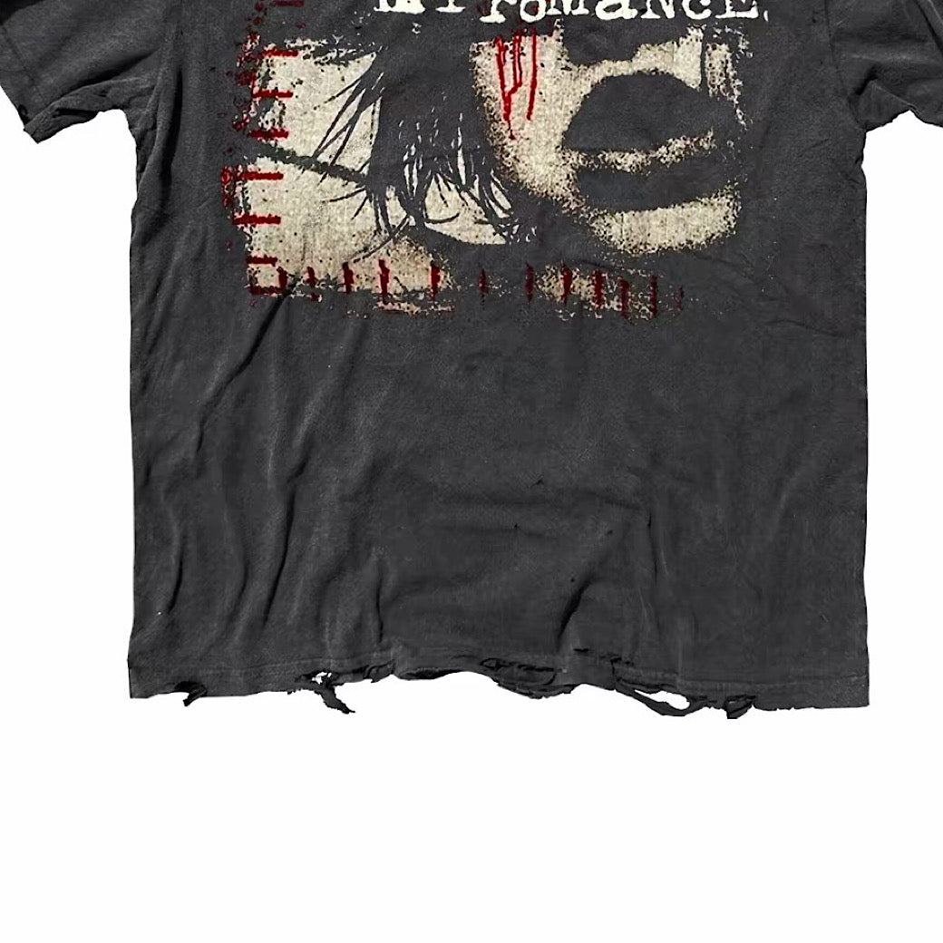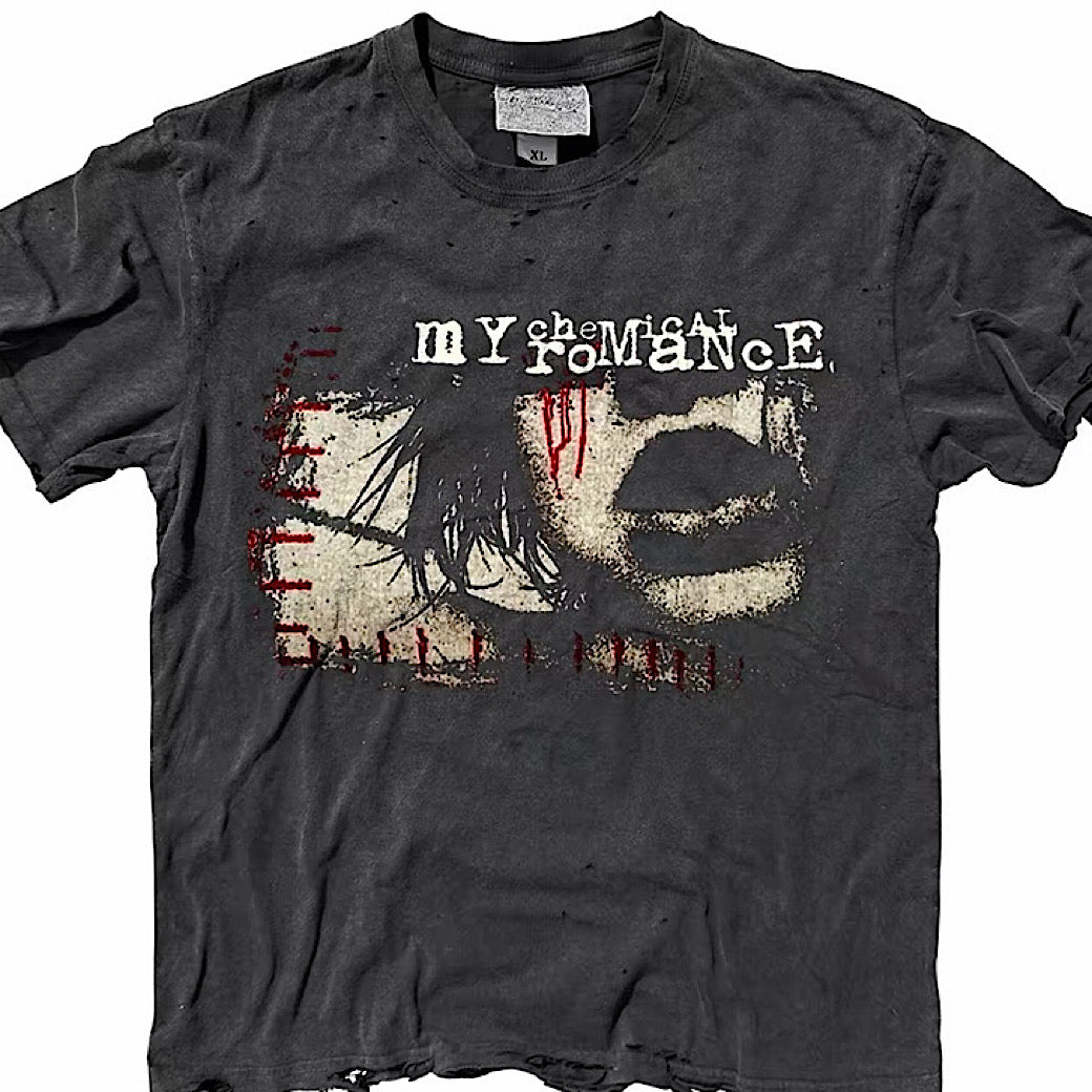 全体的にダメージ加工が施された半袖Tシャツ。