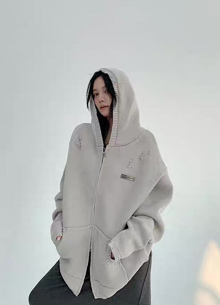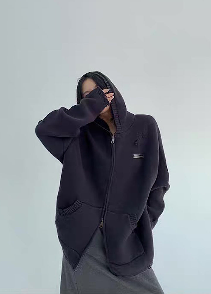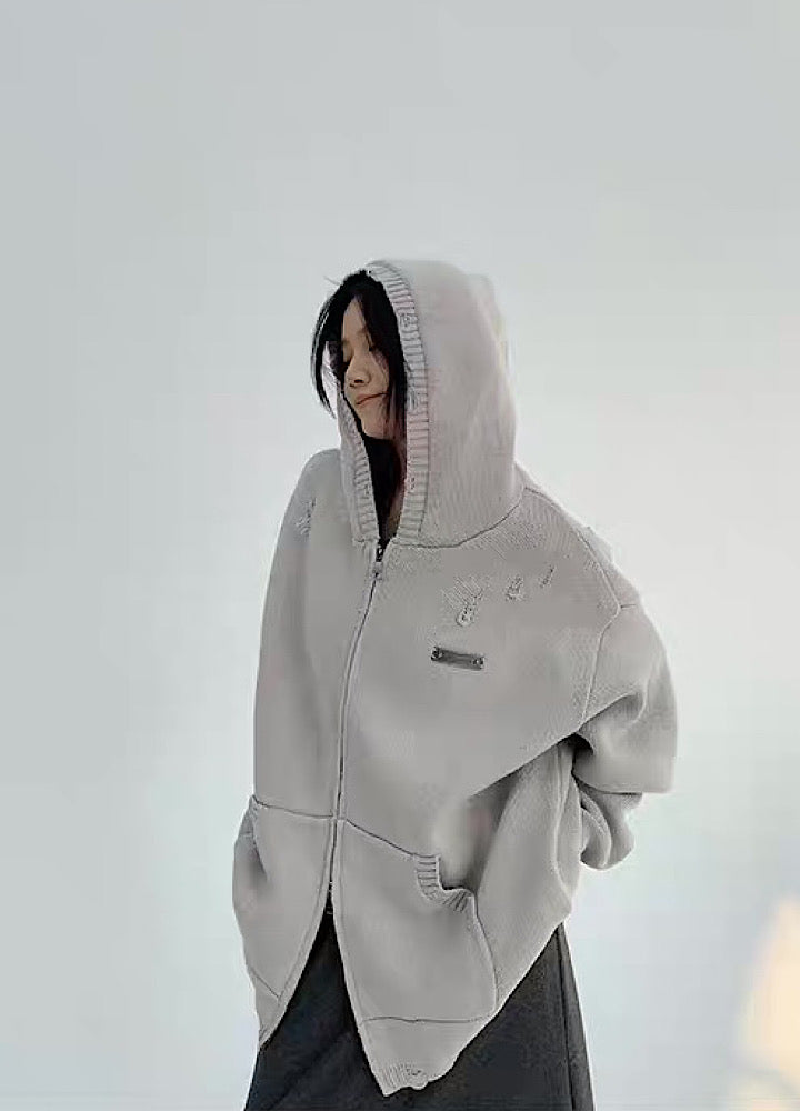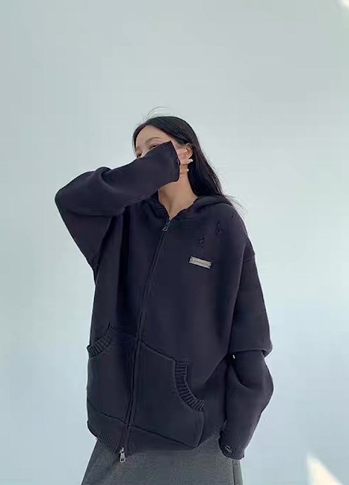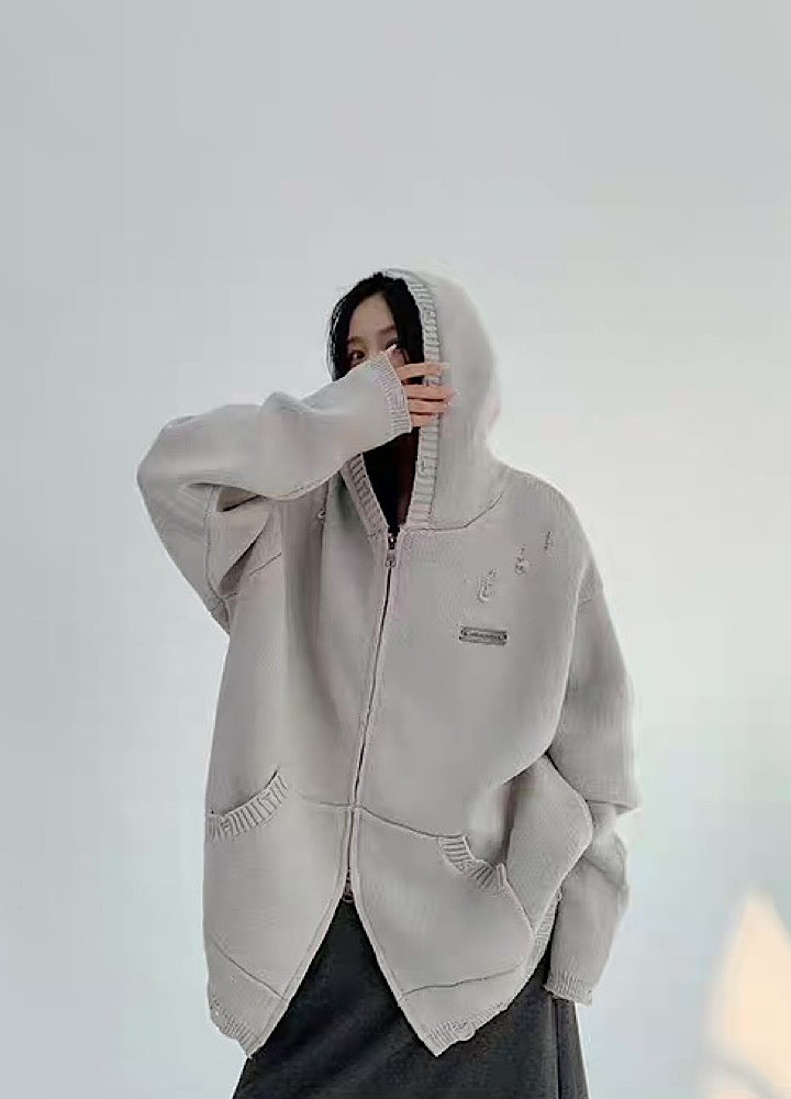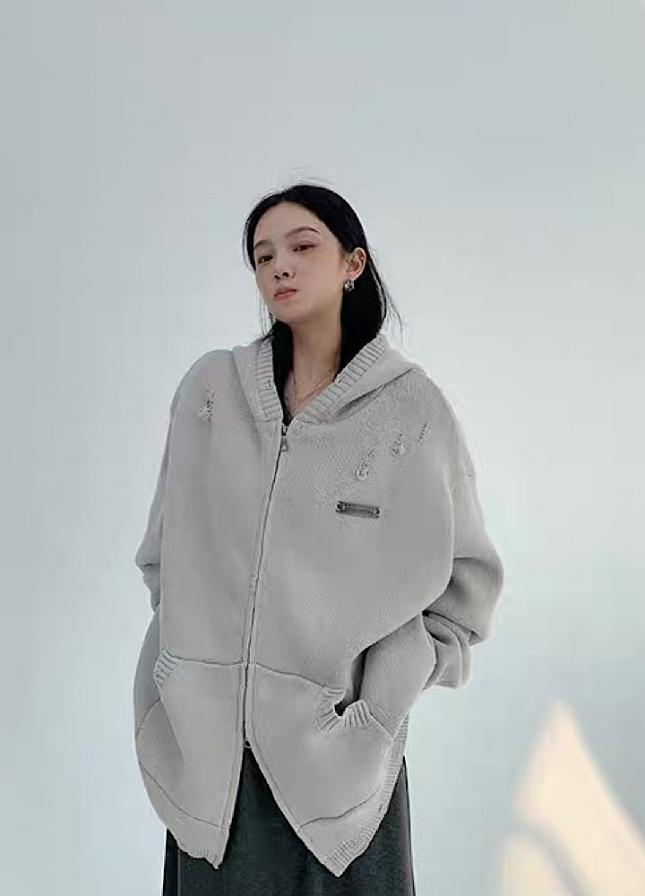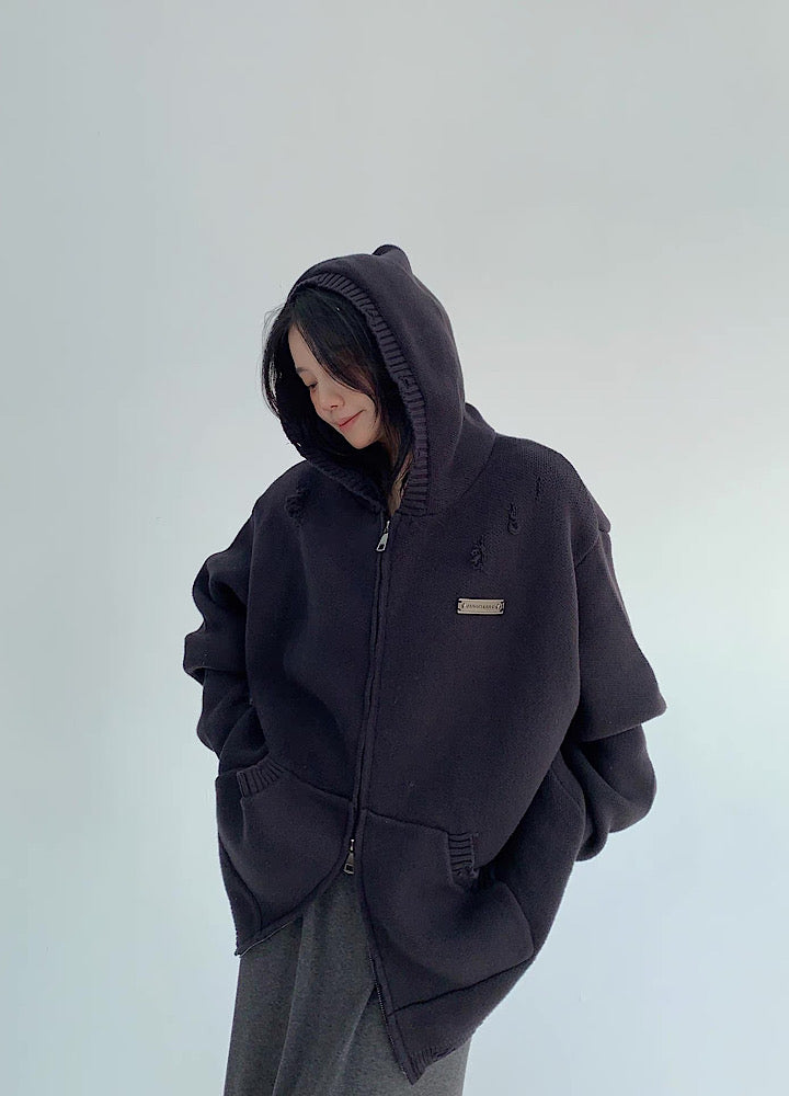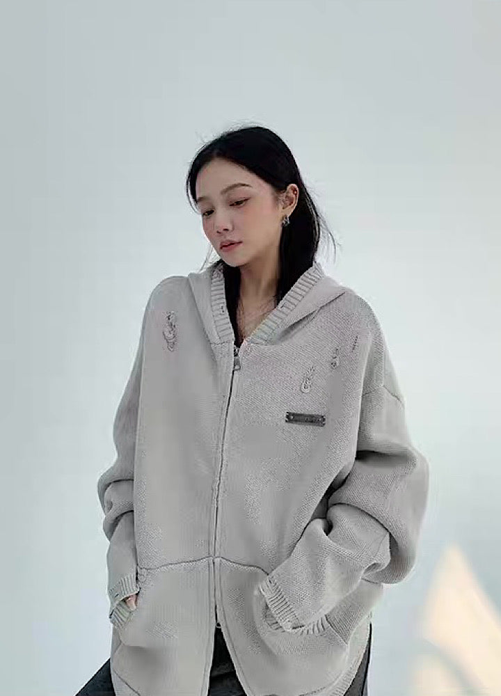 Double-zip mid-length distressed basic design knit hoodie  HL3219