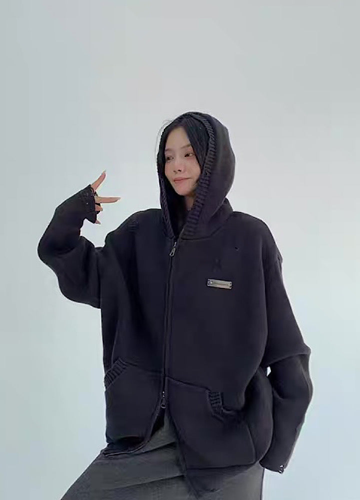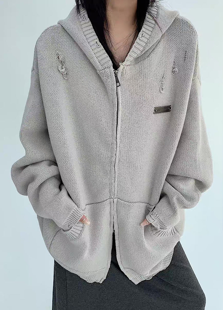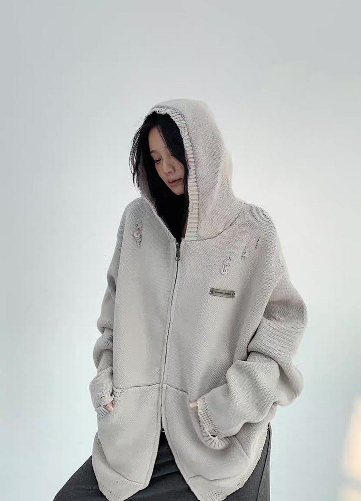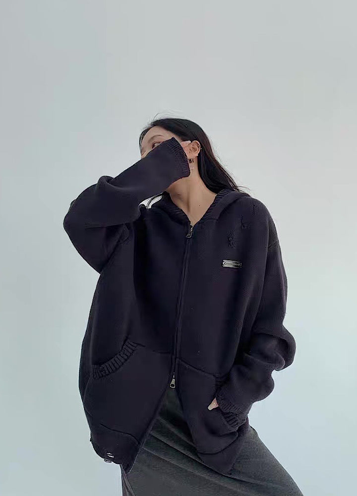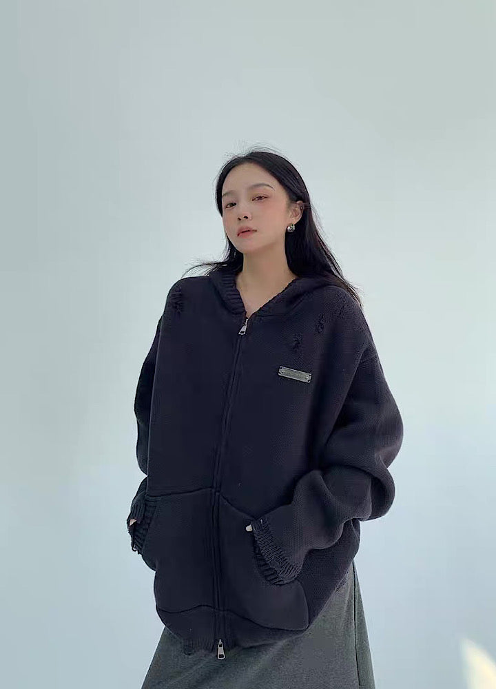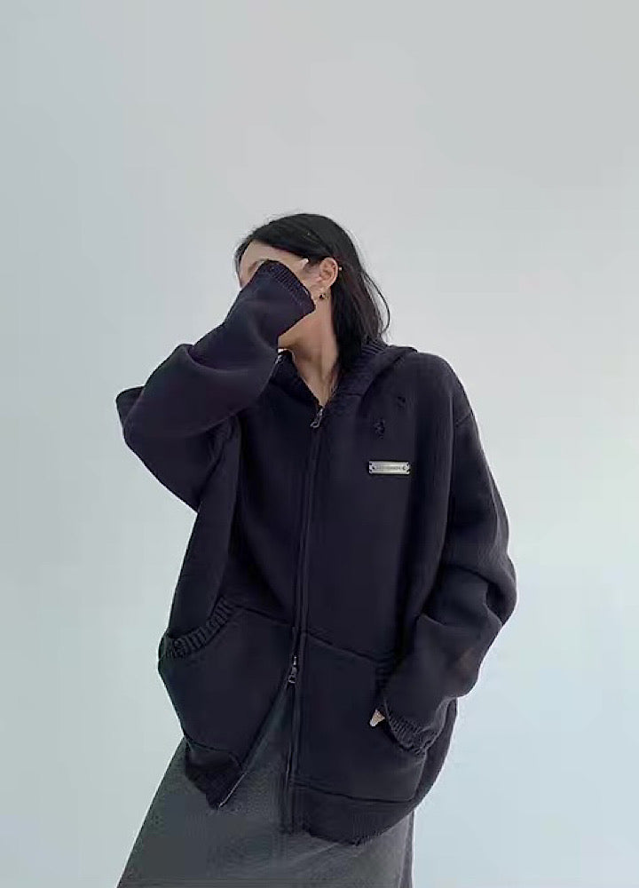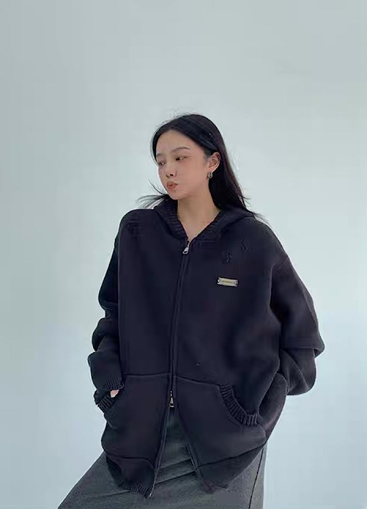 Double-zip mid-length distressed basic design knit hoodie  HL3219