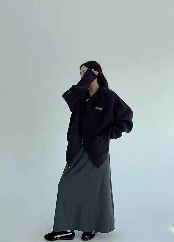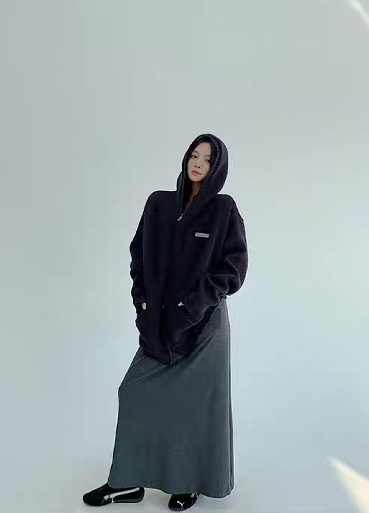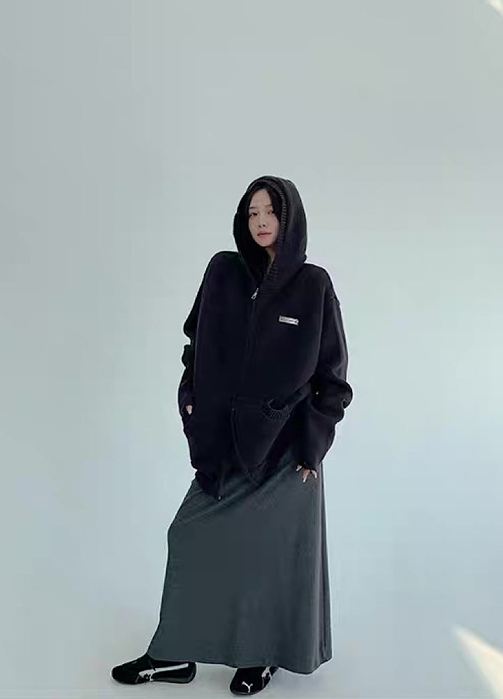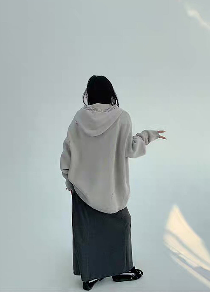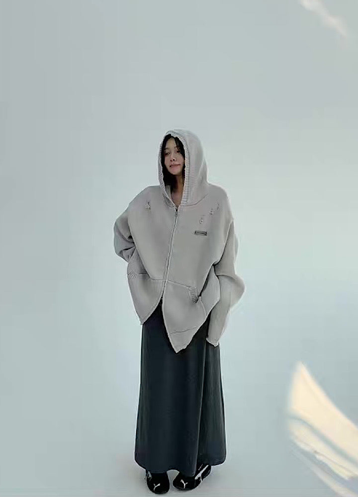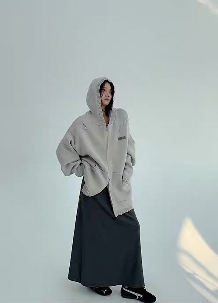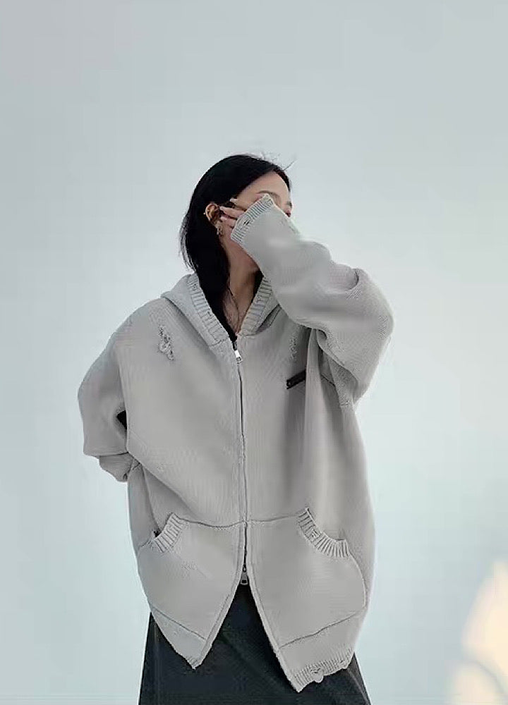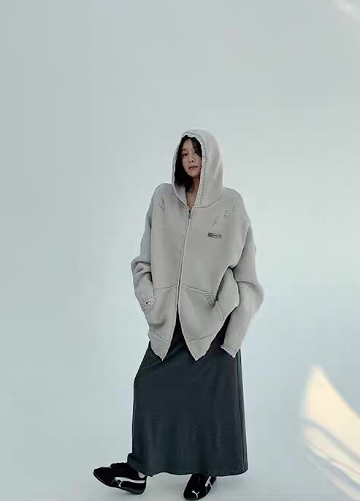 Double-zip mid-length distressed basic design knit hoodie  HL3219