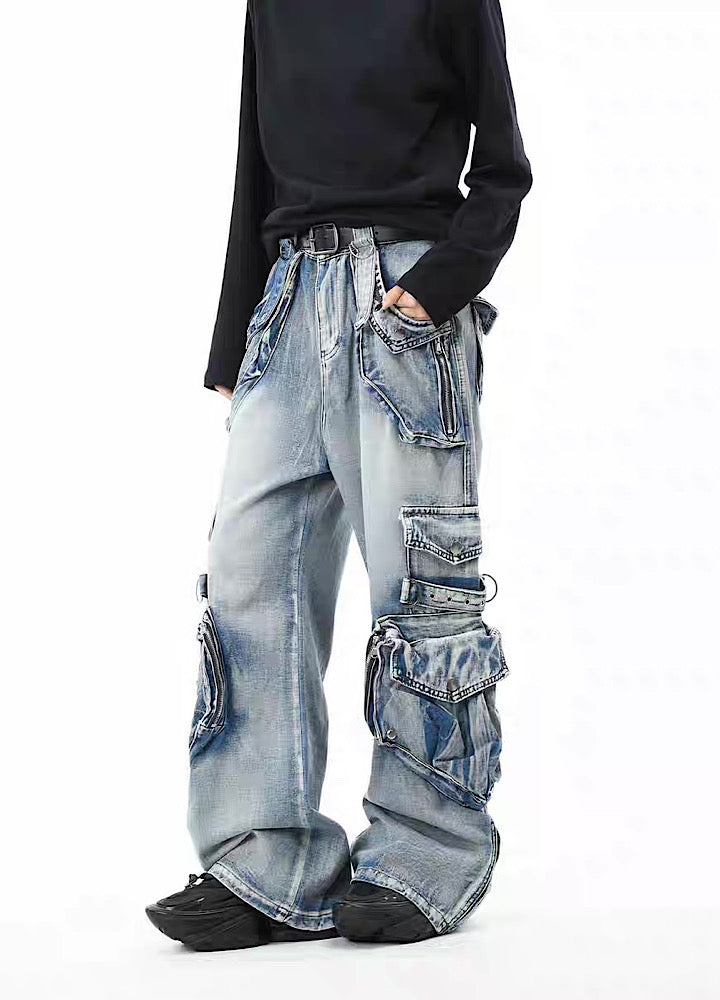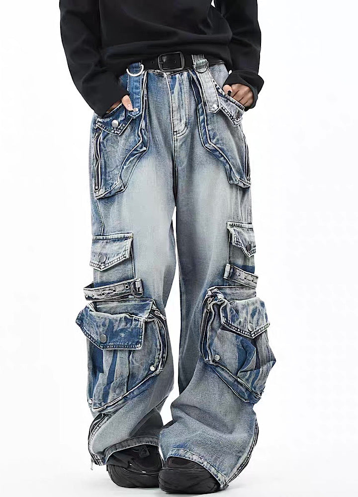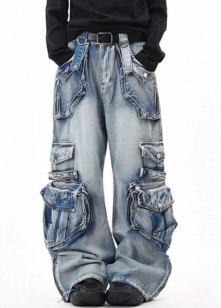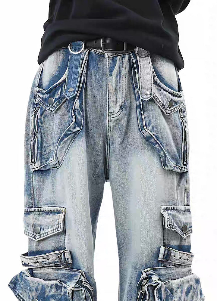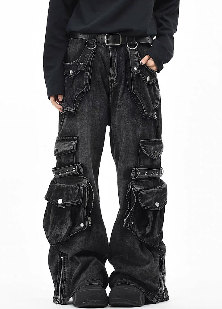 無数のポケットデザインが施されたデニムパンツ。
