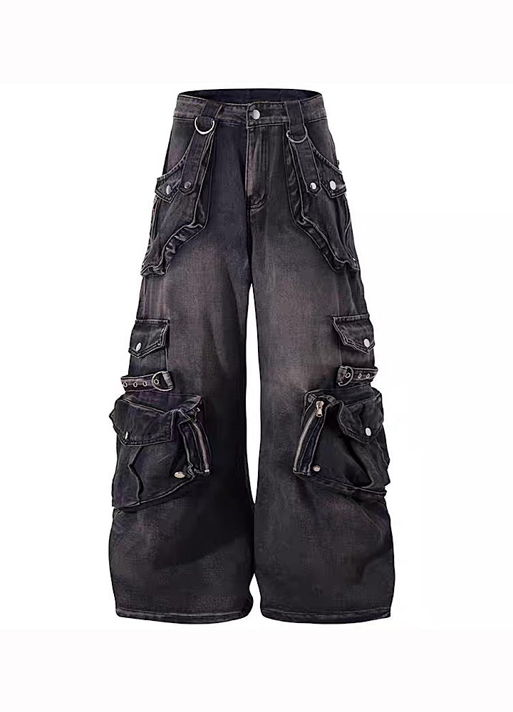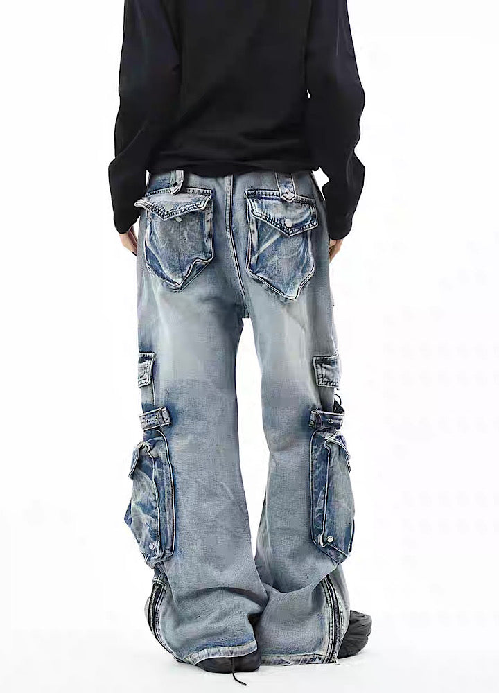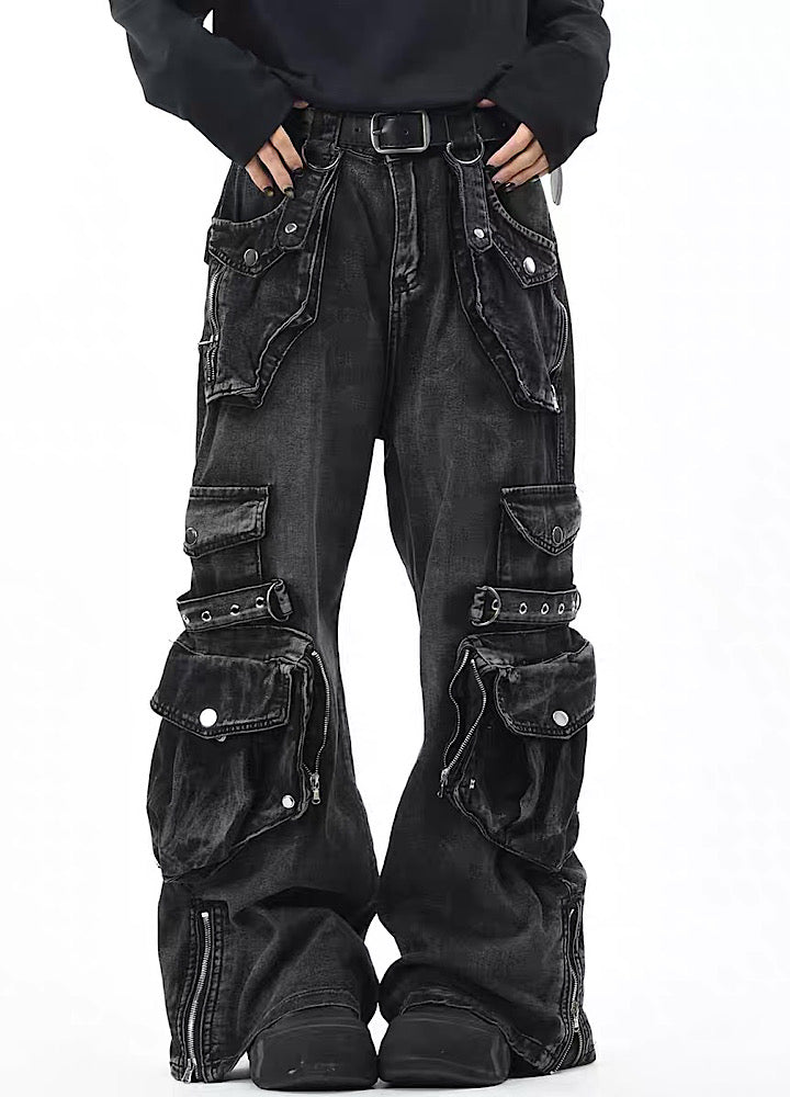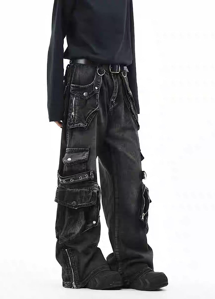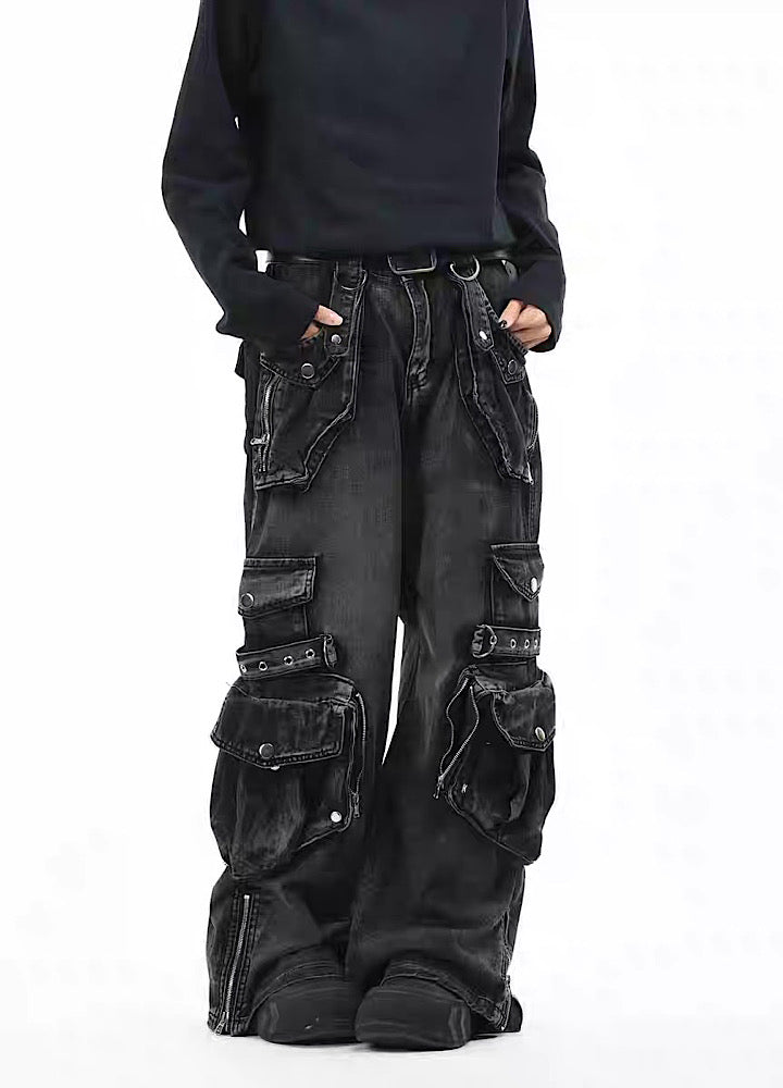 無数のポケットデザインが施されたデニムパンツ。