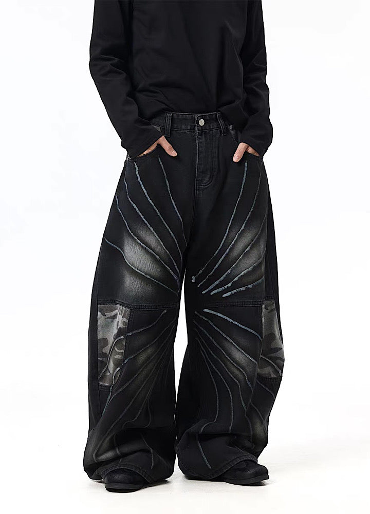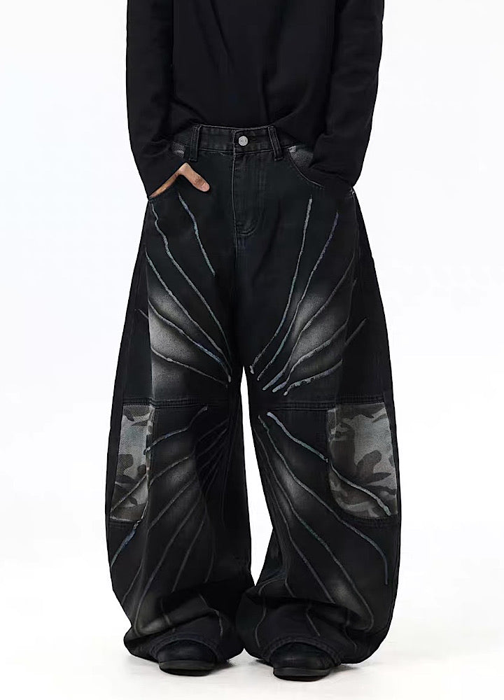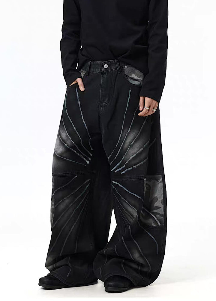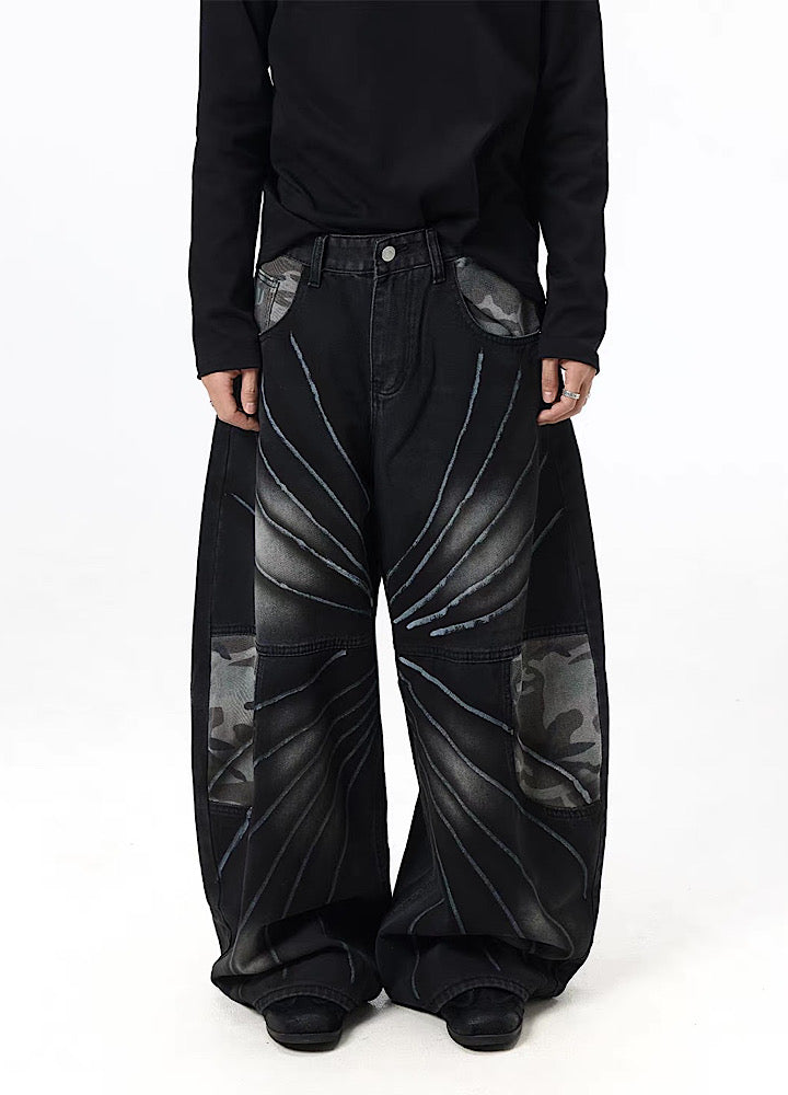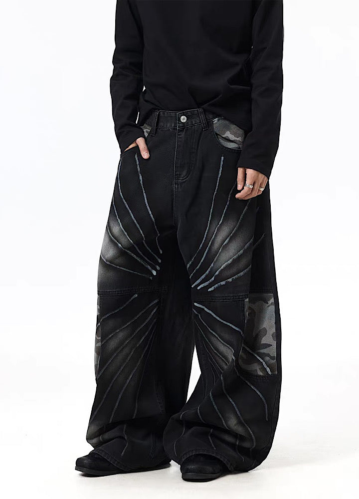 【BTSG】Claw mark design distressed washed point camouflage wide denim pants  BS0073