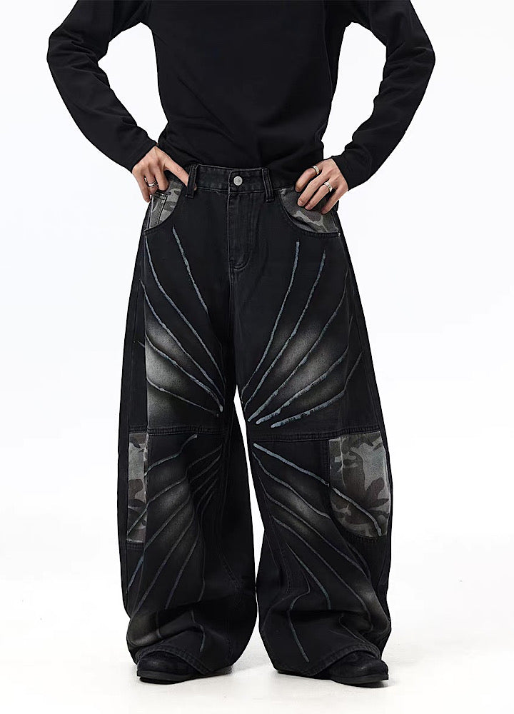 【BTSG】Claw mark design distressed washed point camouflage wide denim pants BS0073