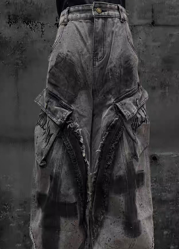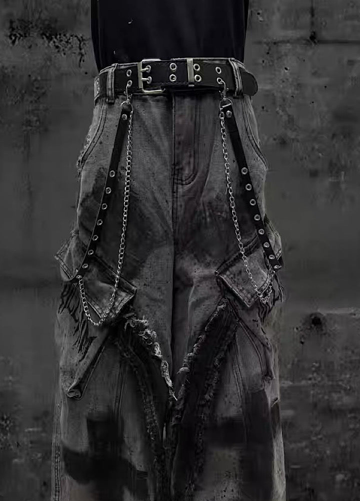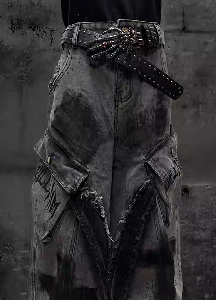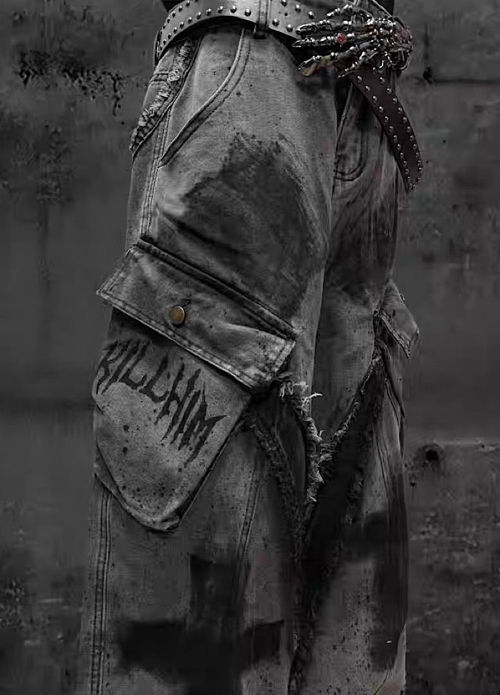 ペイントデザインが施された特徴的なデニムカーゴパンツ。