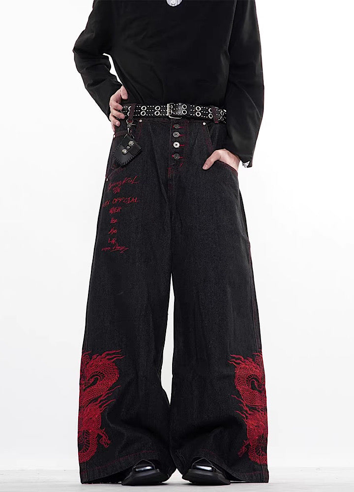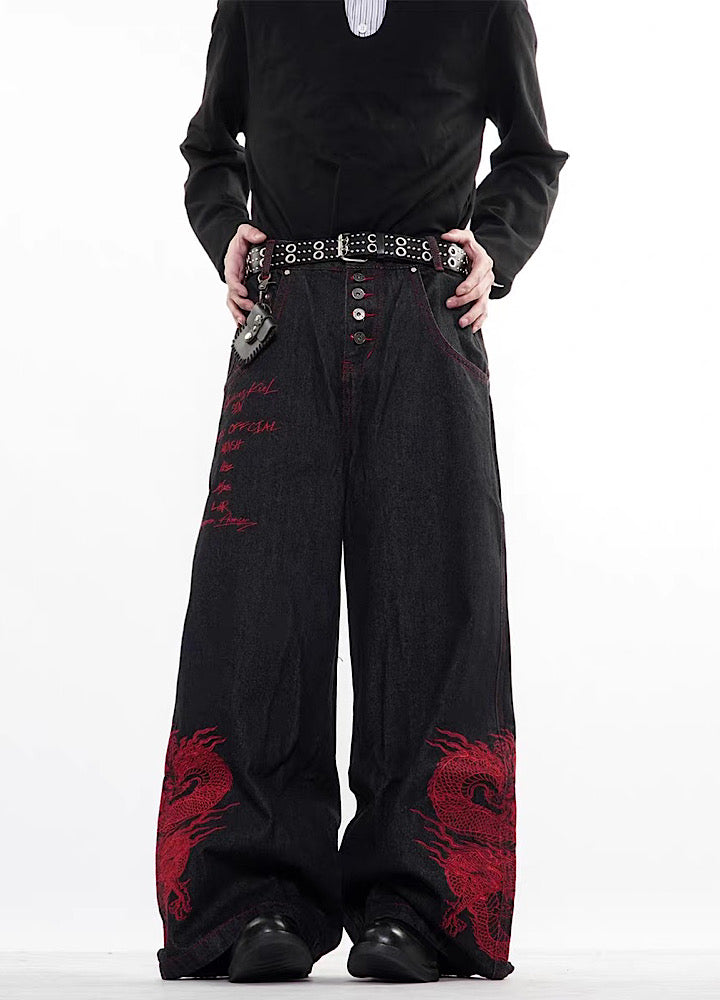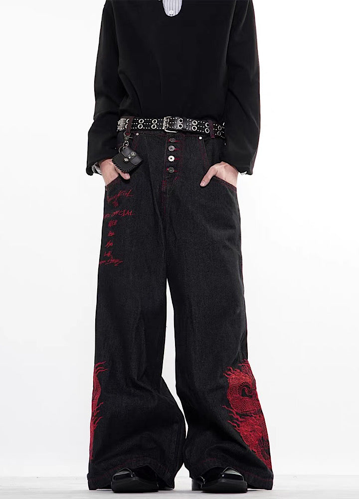 【76street】Red stitch color side dragon embroidery design denim pants ST0019
