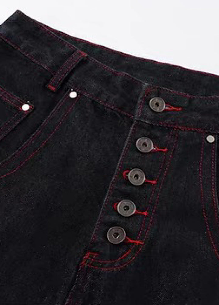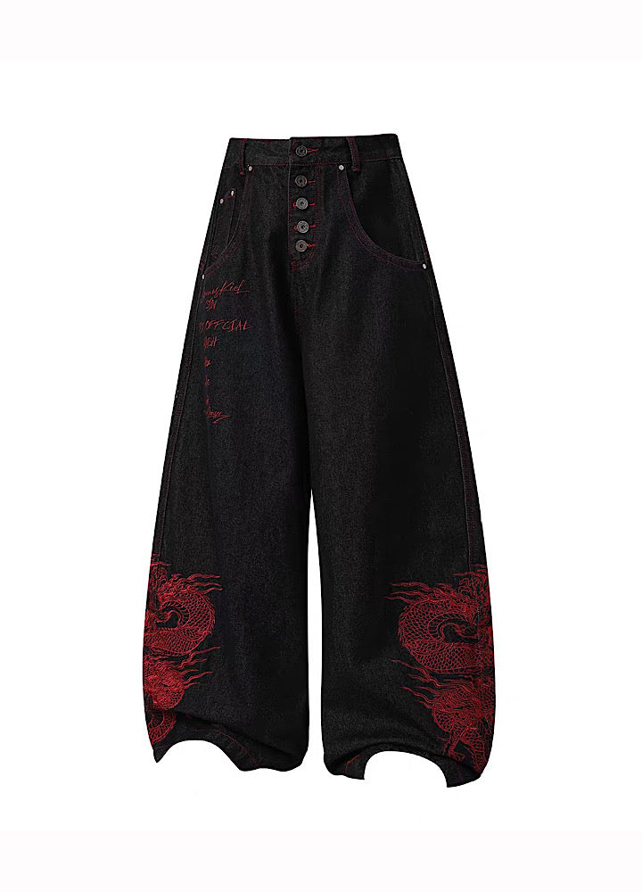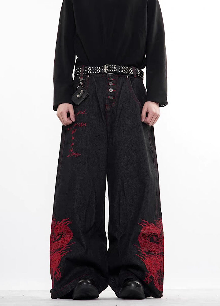 【76street】Red stitch color side dragon embroidery design denim pants  ST0019