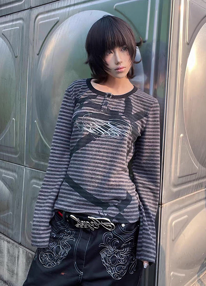 【2/18新作】Simple border design Henley neck style long sleeve T-shirt HL3232